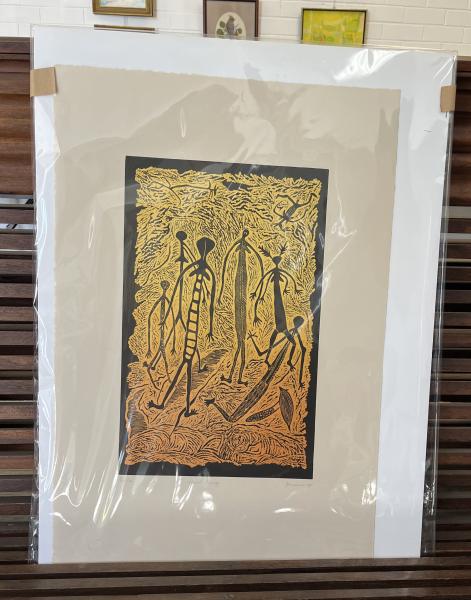 Hand coloured linocut